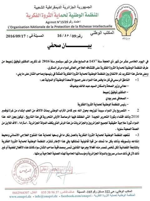 خبر حصرى: تم تكريم مخترع دواء السكري : الطبيب والباحث توفيق زعبيط ، بجاىزة عن دوائه الذي اكتشفه ، واصبح حديث العام والخاص ، حيث اخبرت من طرف احد المقربين بان ابن احد المسؤولين الجزاىرين استعمل الدواء ، لمدة ستة ايام تحسنت حالته بصورة جيدة بغض النظر عن الحالات التي شاهدتها في قناة الشروق الجزائرية التي نقلت شهاداة حية لمرضي السكري وتحسنت حالاتهم .